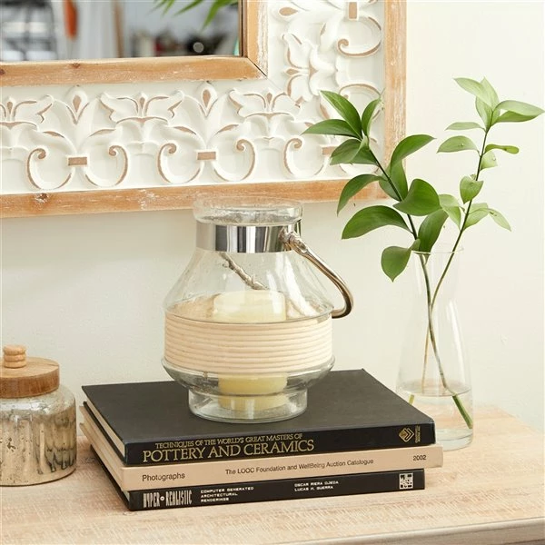 - Silver metal and beige ribbon strips decorate the clear glass lantern