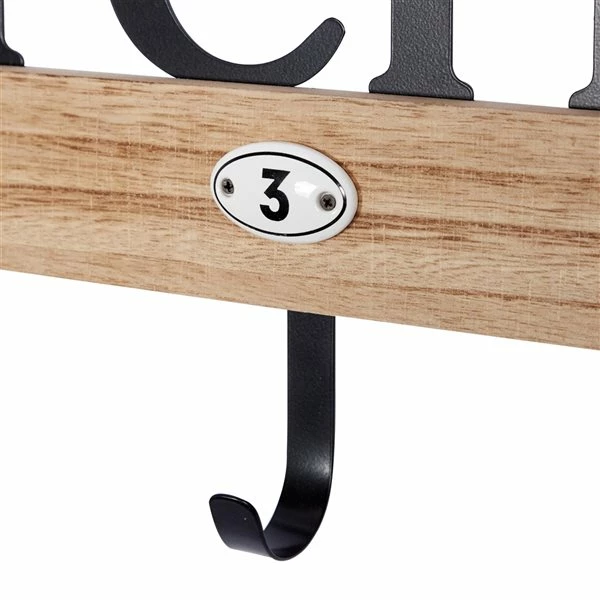 - Crafted with a wooden wall mount and metal hooks