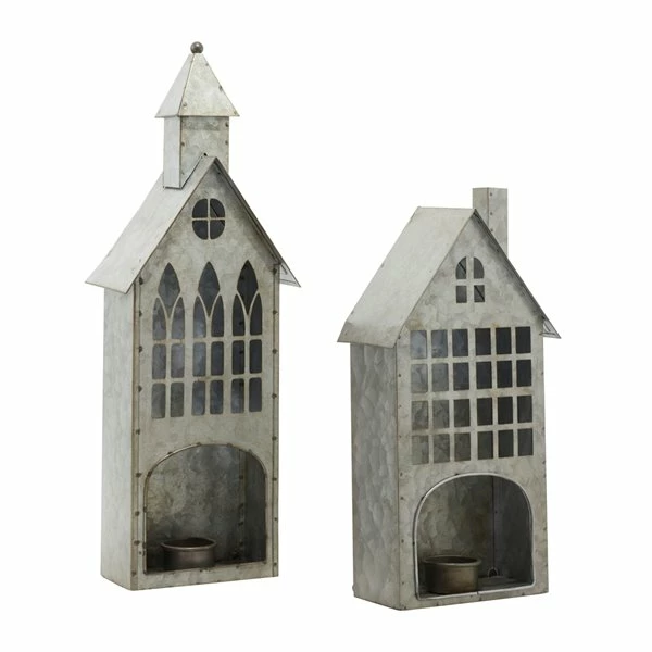 - This set of grey metal candle holders features house-inspired frames with round votive candle plates inside