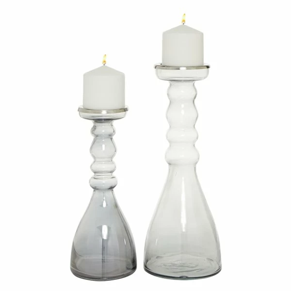 - Features two clear candle holders in varying heights and sizes, come with secured candle platforms to catch drippings