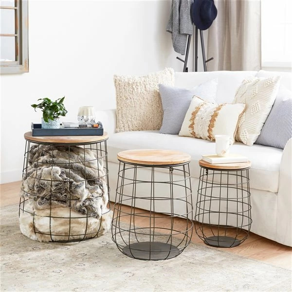 - This 3-piece wire basket with lid set features an industrial-farmhouse design that sits well next to brown wood