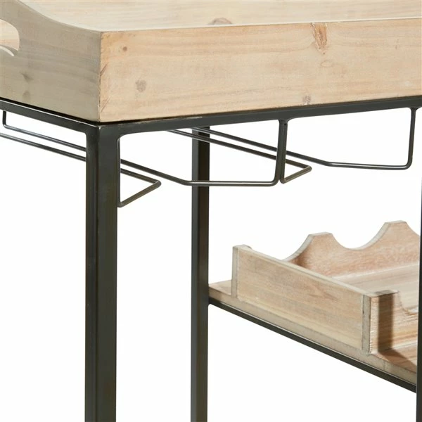 - Furnished with solid wood shelves and metal frame that is spacious and can hold up to 15 wine bottles. Has 2 rows of wine glass racks and a tabletop for other wine necessities