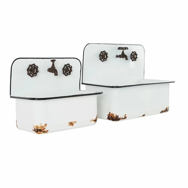 - White antique tub sink shapes and rust accents for a worn look with brown iron faucets