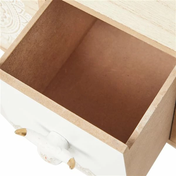 - This rectangular jewelry box with legs has a mid-century modern style with detailed eclectic mandala patterns painted in white over two of the light natural wood drawers with metallic gold round handles.