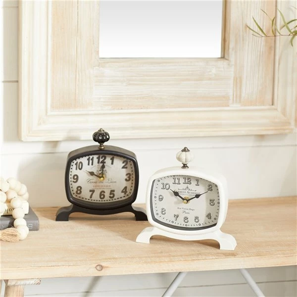 - Stylish and functional, this set of 2 table clocks is ideal as accent table decor pieces for your vintage-styled space with their gourd-shaped finials, wide serpentine feet, and bold serif numbers