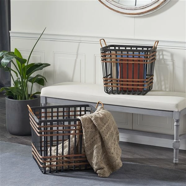 - Each farmhouse storage basket features woven grid patterns extending to 2 side handles