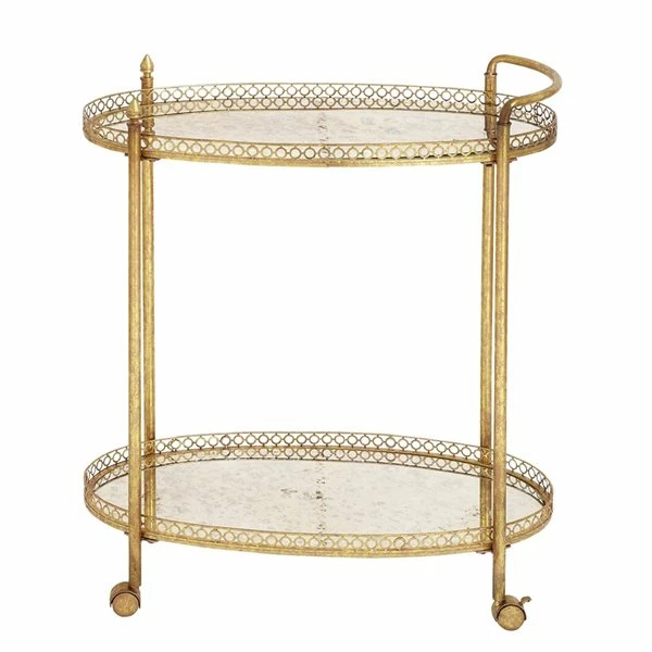 - Metal bar cart with a textured gold finish, decorative gold finials and handle