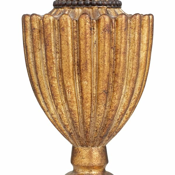 - A gold polystone vase featuring a unique-shaped body with scalloped texture and bead details along with a pedestal base