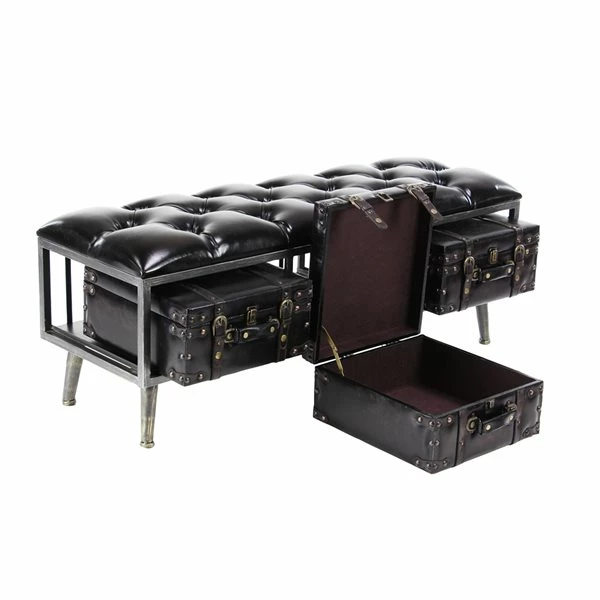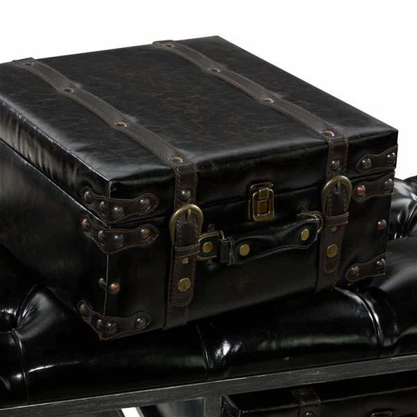 - Designed with glossy black buttoned faux leather seat cushion, furnished with 3 small trunk case storages