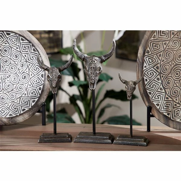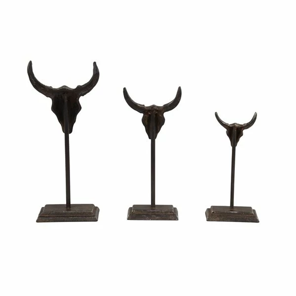 - Features 3 bull skull sculptures mounted on a long iron pole on a rectangular pedestal base