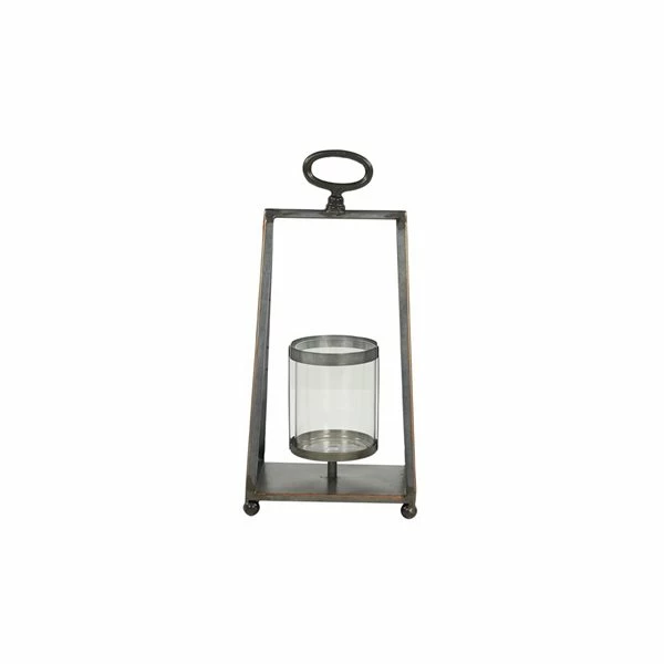 - This industrial glass candle holder features a textural dark silver iron frame with gold accent paint