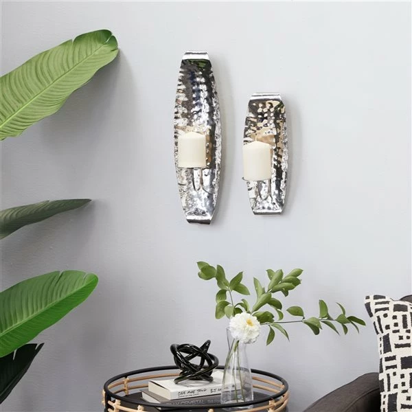 | Manufacturer Color/finish | These beautiful candle holders wall sconces features polished silver with hammered style |