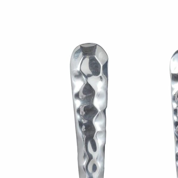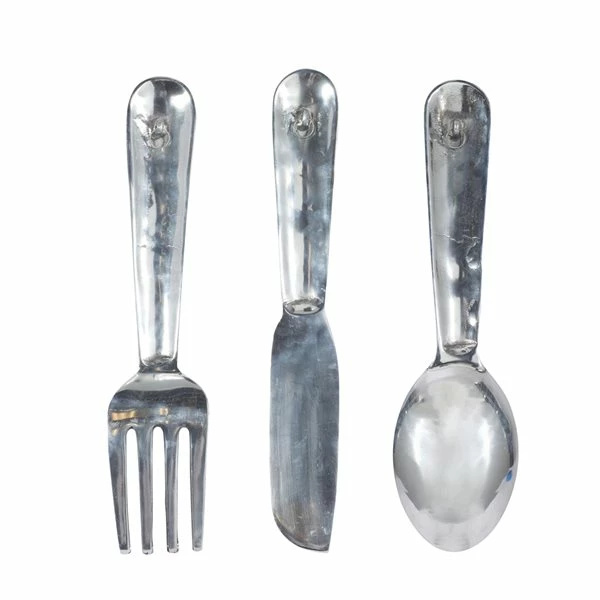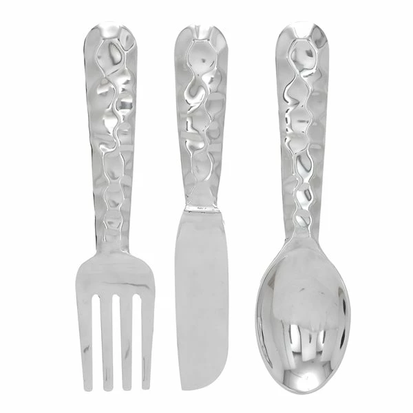 - Features a large spoon, a large fork and a large knife with an artfully hammered look on their handles