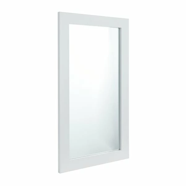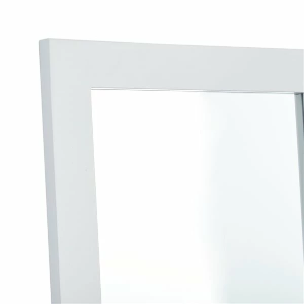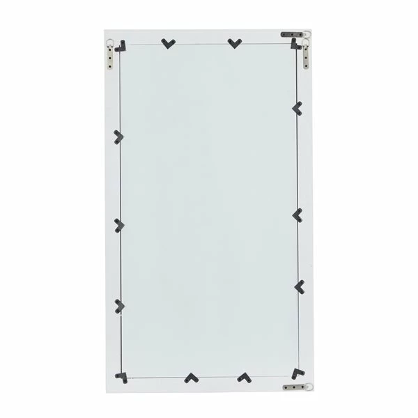 - Features a rectangular-shaped reflective glass and a thick white wooden frame