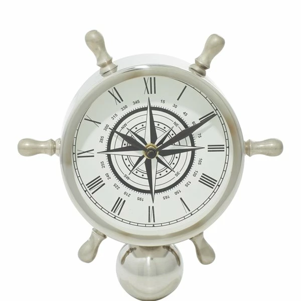 - Wheel-shaped clock’s face is reminiscent of a traditional compass with a solid silver stainless steel construction