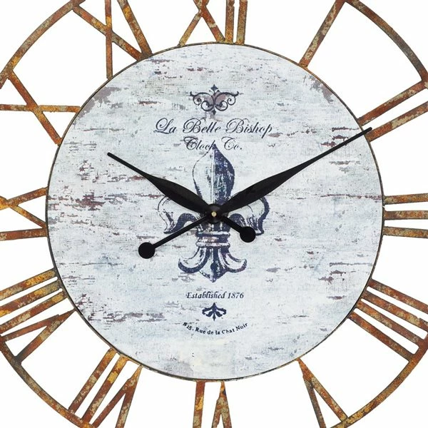 - This fleur-de-lis wall clock highlights rustic brown outline finish and distressed daisy white clock face finish