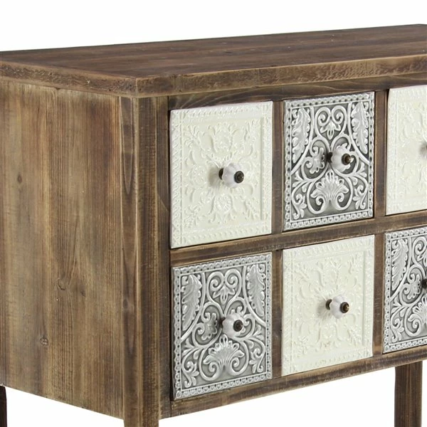 - Drawers have intricate arabesque patterns with alternating distressed white and dark brown finish