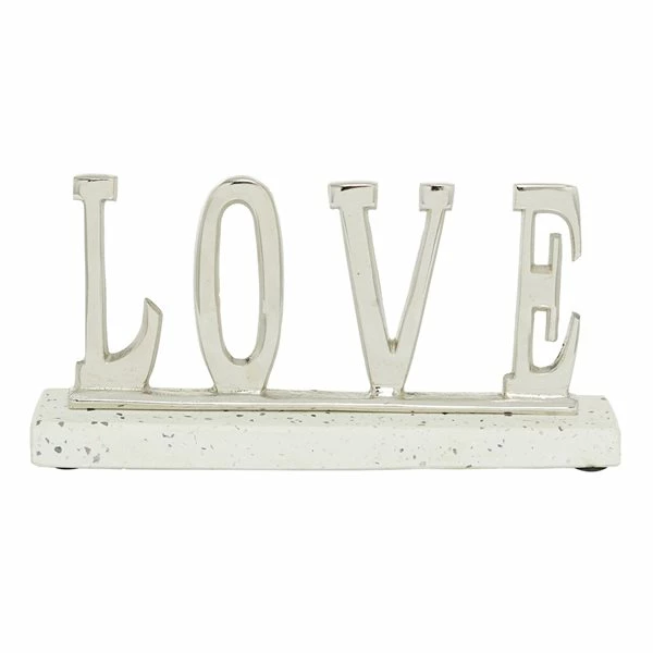 - Metal Love sign with reflective metallic silver finish over capital serif letters with speckled grey and white base
