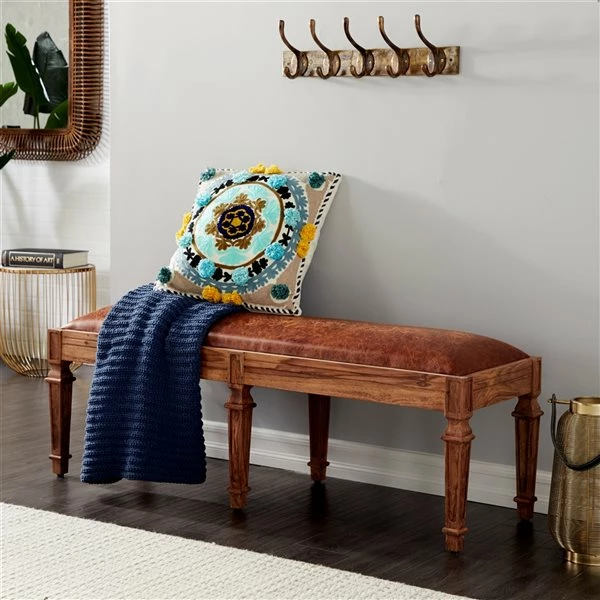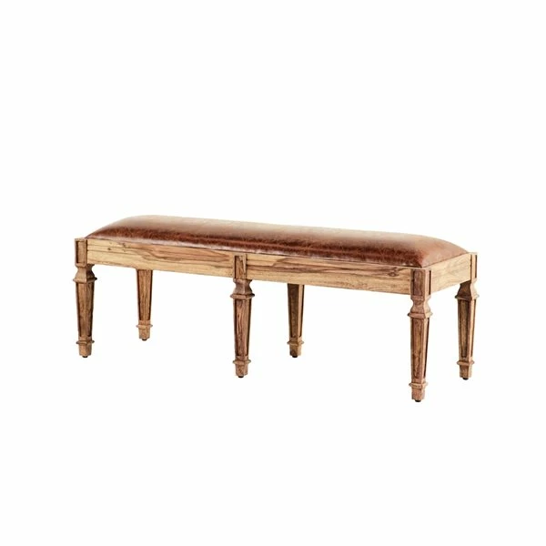 - This entryway bench features a wide design, carved legs, and cushy leather seat