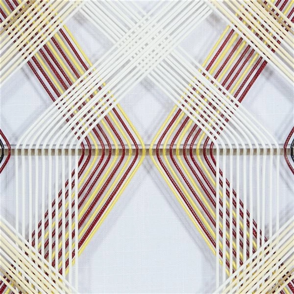 - Metallic silver finish over frame holding black, white, maroon, yellow, beige, and tan string designs