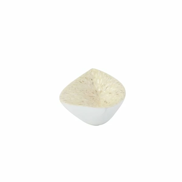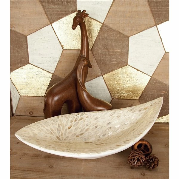 - This one-of-a-kind white display tray showcases an irregular boat shape with leaf-like mother of pearl inlay patterns and a plain white outer base molded from pure polystone