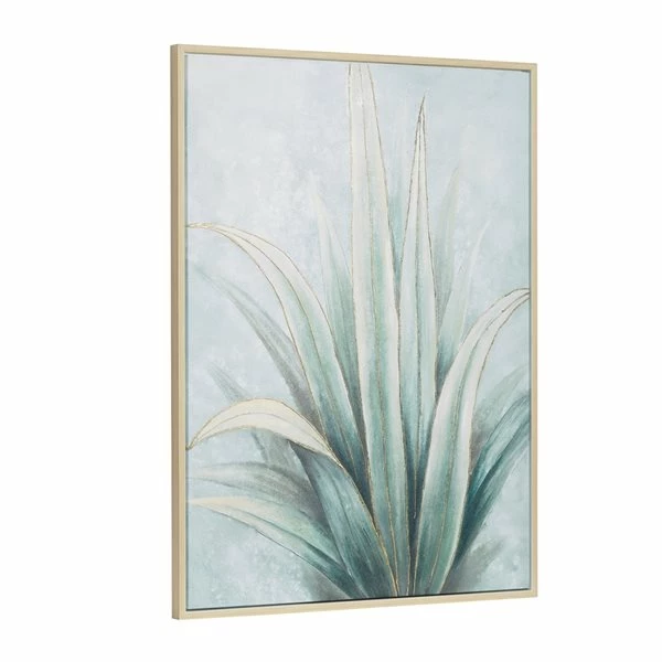 - A white canvas displays a large agave plant painted in pale green to deep green with a light aqua-blue background and housed in a light beige natural fir wood frame