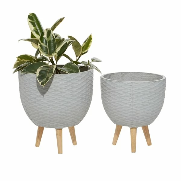 - A ceramic light grey finish with diamond-shaped ribbing surrounds the planters
