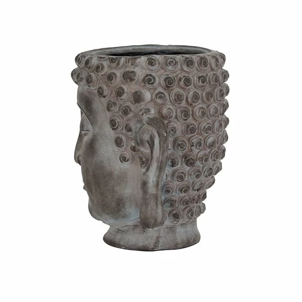 - A dark grey ceramic planter featuring an image of Buddha with detailed facial characteristics and textured head with round and spiral patterns
