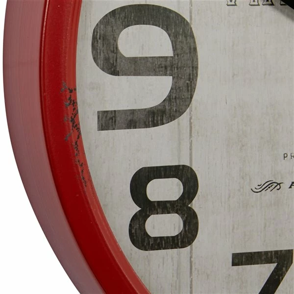 - Distressed red brick finish over housing, light grey clock face with black lettering and numerals