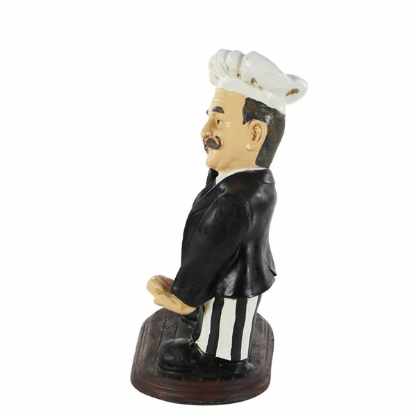 - Features a standing chef sculpture with white toque, black uniform, and striped pants