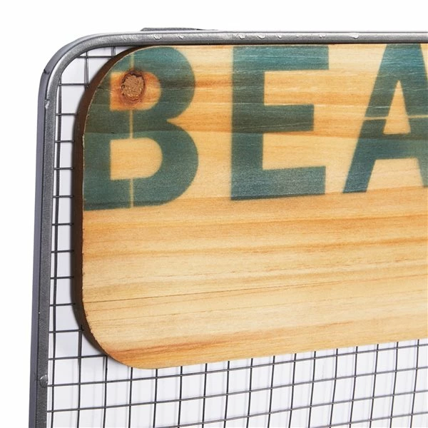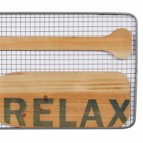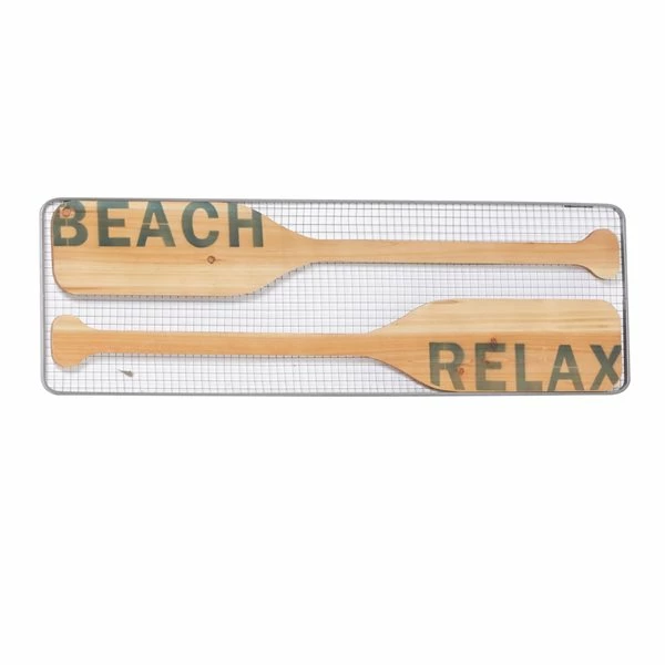 - Features 2 brown paddles labelled with “beach” and “relax” on a frosted grey wire mesh frame