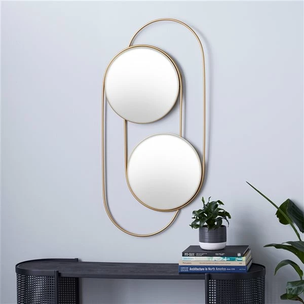 - This wall-mounted piece has two round mirrors and an oval-shaped loop frame