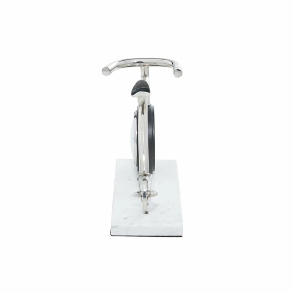 - This metal table clock has a silver and black frame with a white base