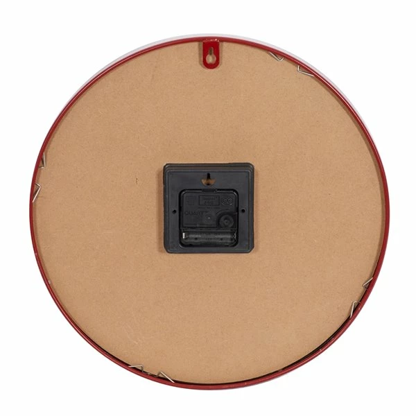 - Features a red bevelled frame, black clock face, white spade hands, and easy-to-read white numerals