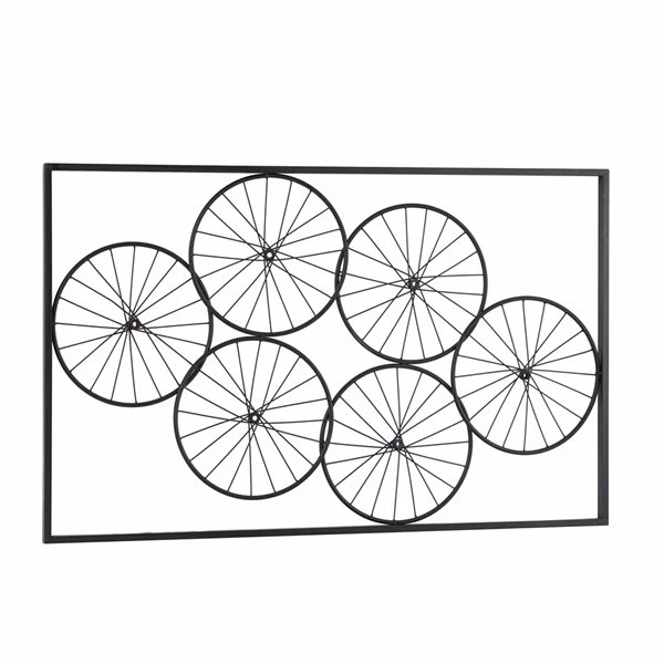 - Showcases six bicycle wheels inside a rectangular frame