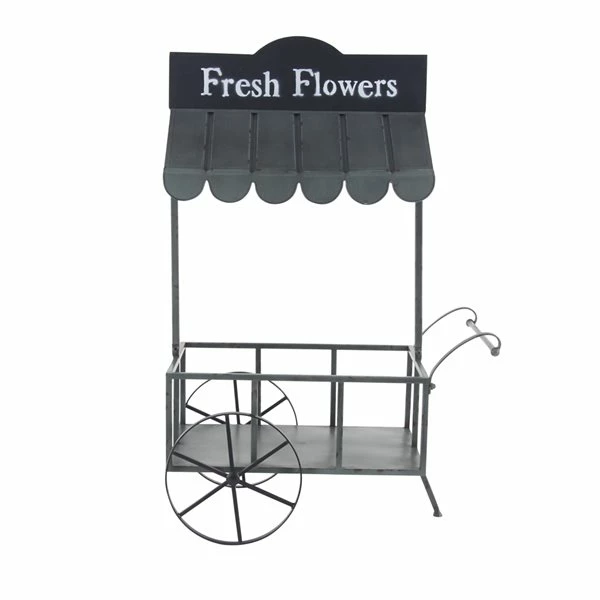 - Metal plant stand with 2 large wheels, kickstand, and a curved handle