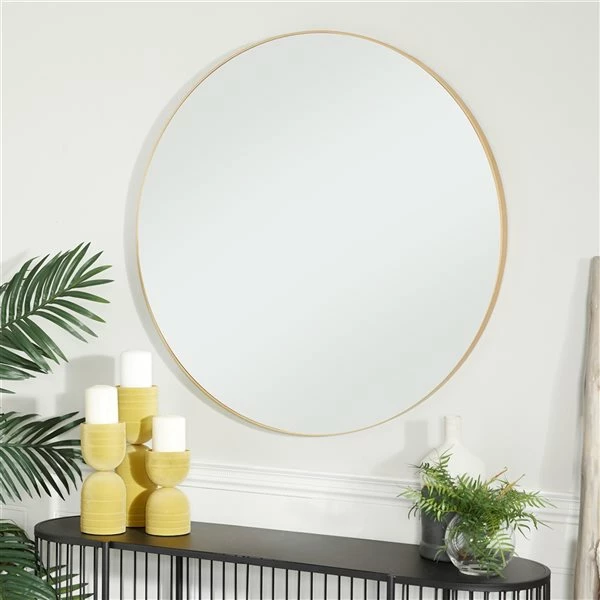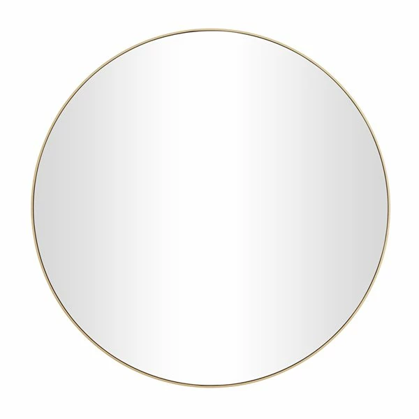 - Features a round-shaped reflective glass and a thin gold wooden frame