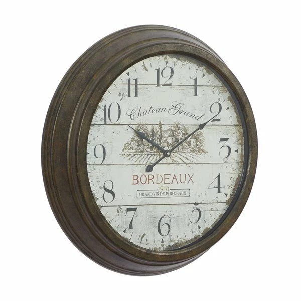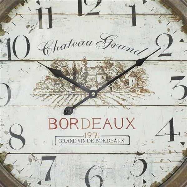 - With black clock hands and easy-to-read numerals, designed with a distressed white iron clock face with French-inspired illustrations