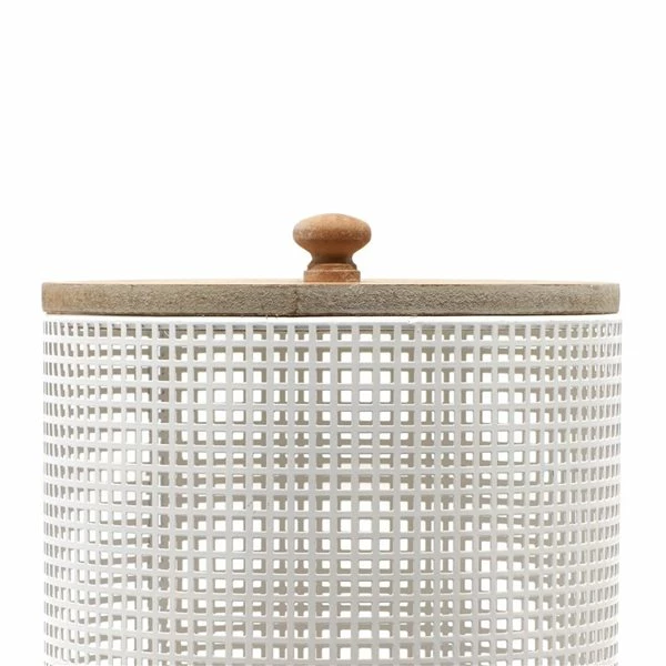 - Features a see-through, cylindrical iron body and a flat base, and natural brown, wooden-finished lid and a finial knob