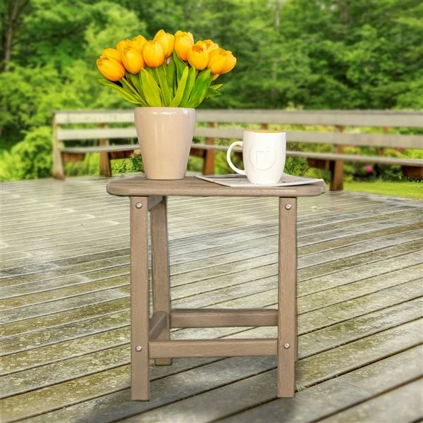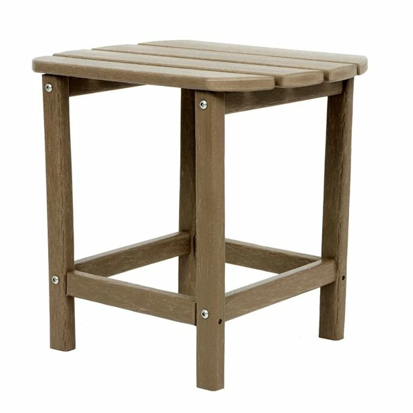 - This brown outdoor side table is made from non-hydroscopic resin. It does not absorb water or moisture from the air and is resistant to cracks