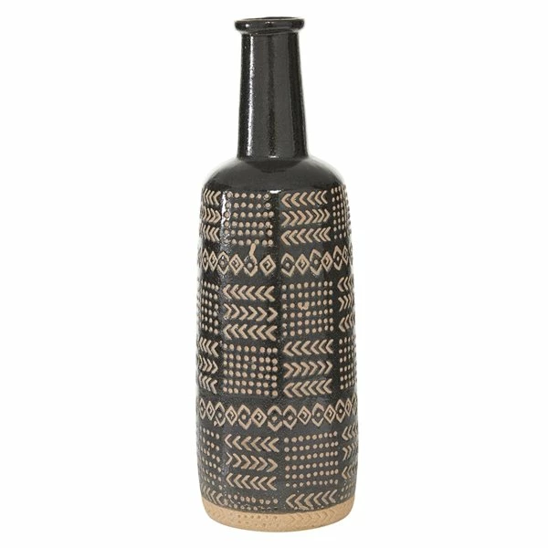 - Bold and detailed in design, this vase has Polynesian style with geometric shapes and patterns formed by glossy black glaze over a matte tan porcelain