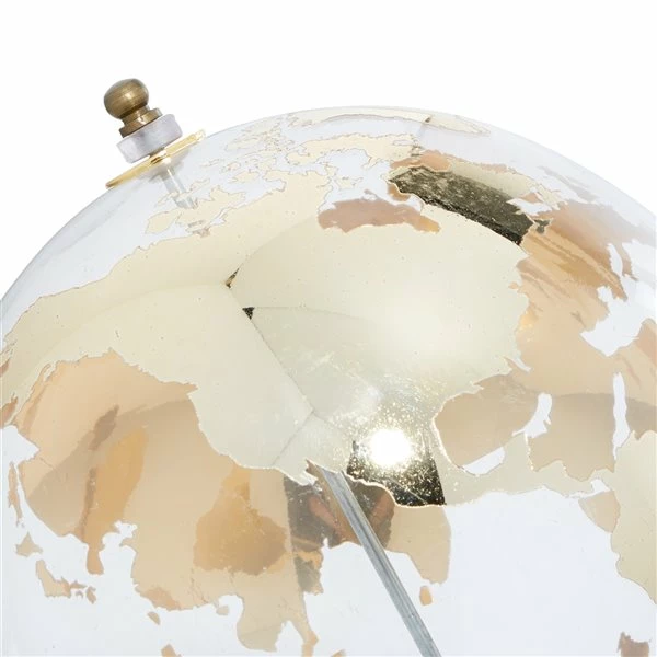 - Displays world map with no labels with transparent glass, metallic gold, and natural golden-brown wood grain