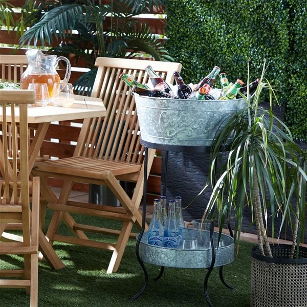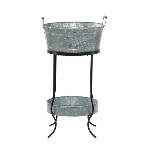 - This grey galvanized bucket cooler features a bottom tray held by curved leg stands