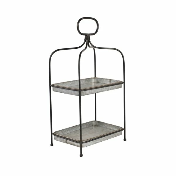 - This 2-tier tray stand has rectangular serving trays housed in a black metal, arched-silhouette frame with an oval metal handle