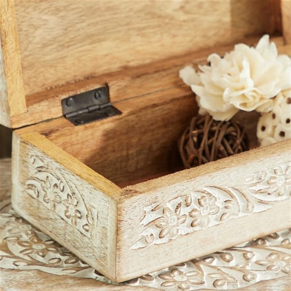 - Beautiful carved flower details on the lid complemented by the distressed natural wood finish